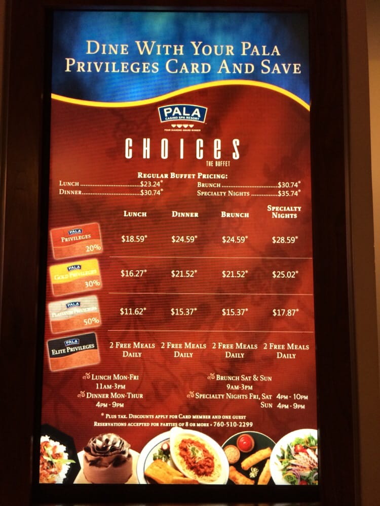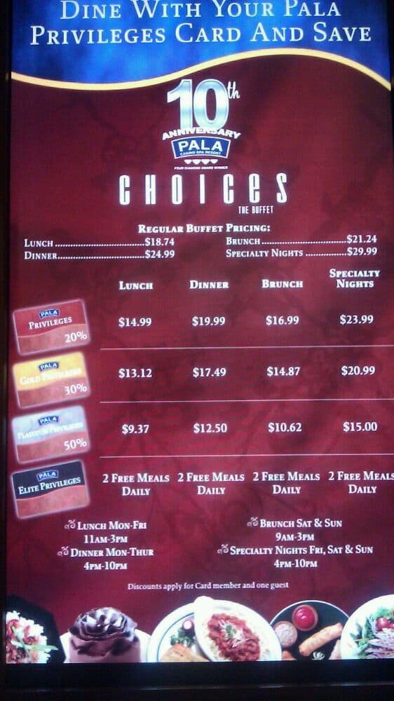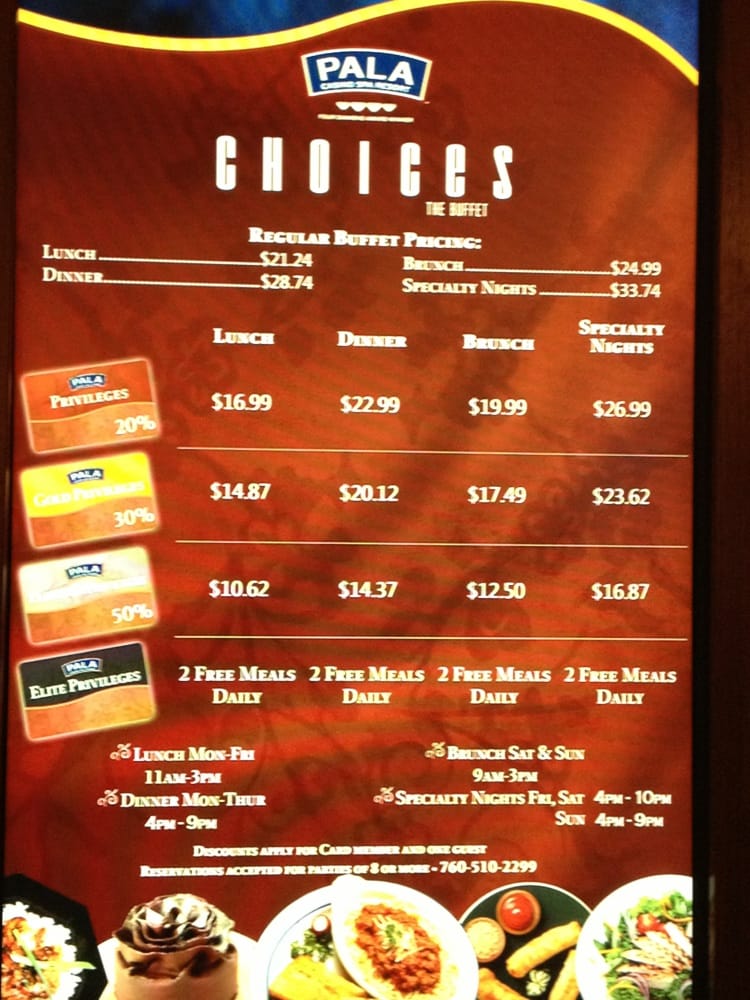 Introducing Choices Buffet, a top-notch buffet located in Pala, California. This buffet offers a wide selection of food, including pescatarian, vegan, and vegetarian options. They accept credit cards, provide waiter service, and have free Wi-Fi. Choices Buffet is a great spot for brunch, lunch, dinner, and dessert. Customers rave about the delicious desserts and attentive service. The Holiday dinner on New Year's Eve was particularly impressive, with surf & turf entrees and rich desserts. The atmosphere at Choices Buffet is elegant, with leather seats and well-lit dining areas. The buffet includes various food selections, such as Mexican, Italian, American, and Asian cuisine. Fan favorites like king crab legs and lobster nights on Thursdays keep customers coming back for more. Despite some mixed reviews on food seasoning and overcooked beef, Choices Buffet stands out as one of the best in San Diego County, offering a dining experience worth trying.